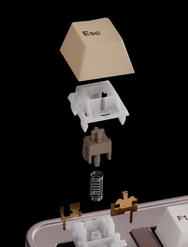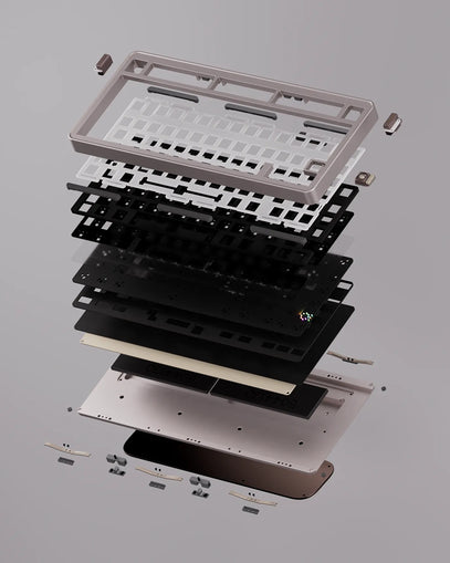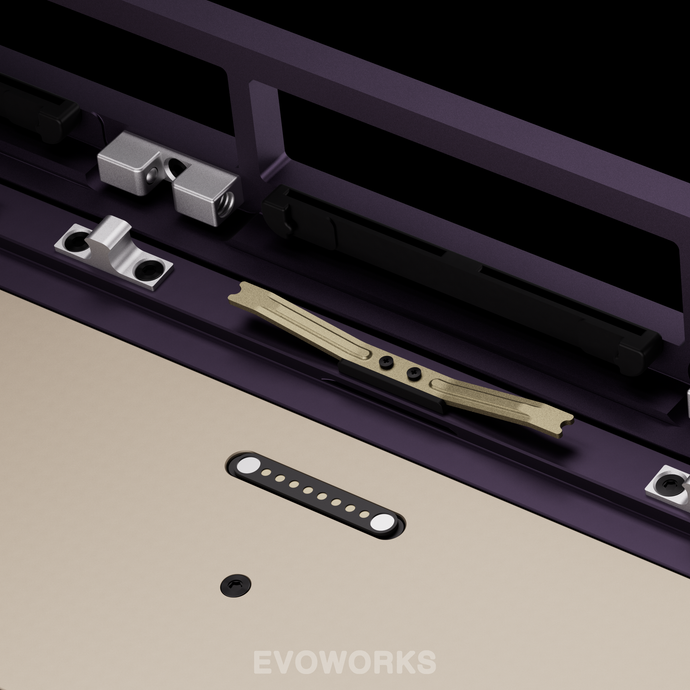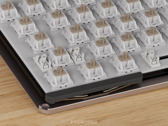Evo75 features our butterfly leaf spring structure with a triple-layer shock absorption system. The butterfly leaf spring provides a typing experience that's bouncy yet stable. Long silicone gaskets on the plate minimize hollowness and noise from the leaf spring while ensuring consistent sound across all keys, including those near mounting points. A silicone cushion positioned beneath the leaf spring reduces vibration between springs and case, effectively eliminating case ping.