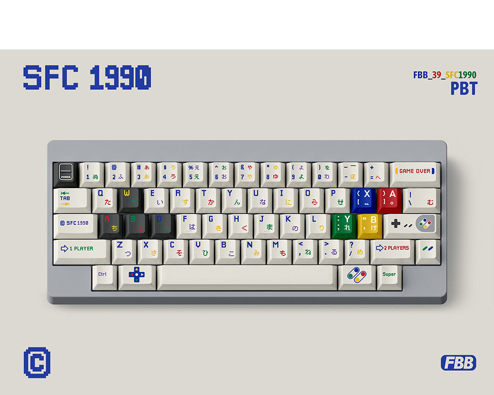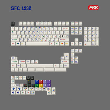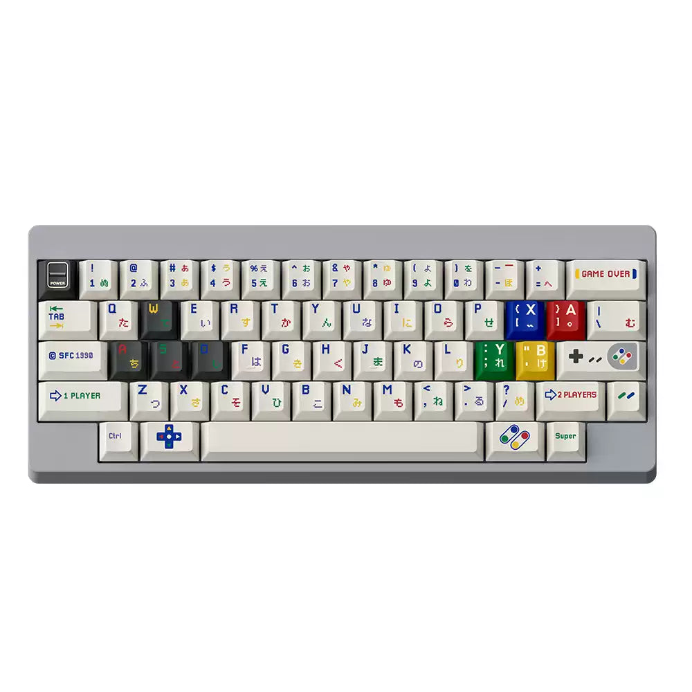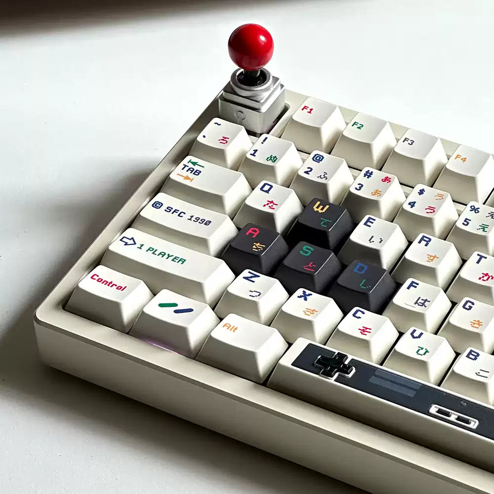 This keycap set inspired by the Nintendo Super Famicom, it uses an off-white base with small, colourful legends that reference the Famicom controller button colours.